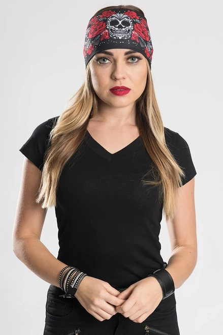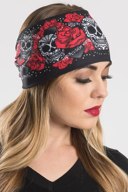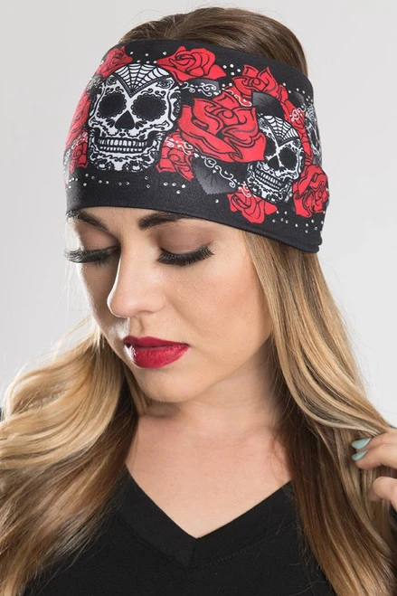 EZ BANDZ Headband, Sugar Skull & Roses w/ Gemstones