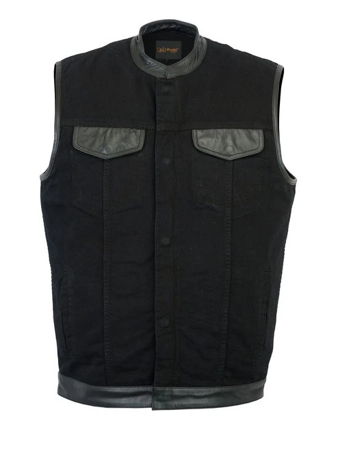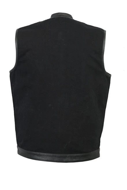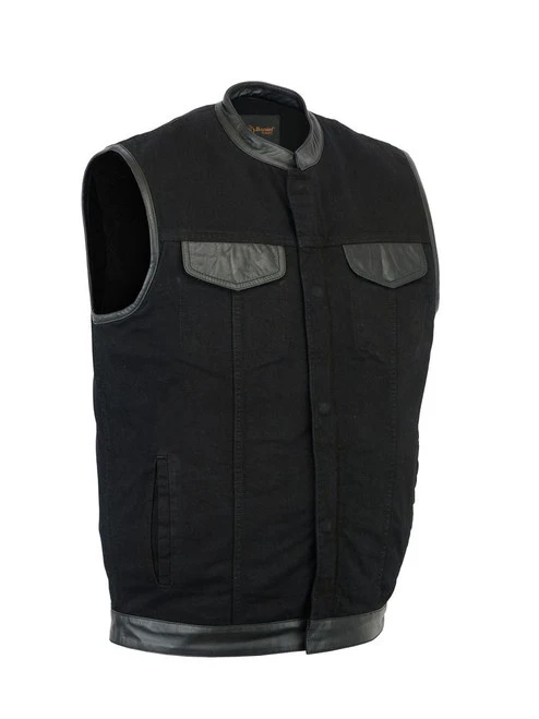 A club style vest made of a lightweight black denim with leather trim to give you the style you want but without heat of wearing full leather.