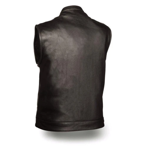 Men Zip Up Conceal Carry Leather Motorcycle Vest w Collar Features: