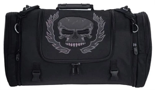 Travel in style with this Unik motorcycle sissy bar luggage bag with a reflective skull graphic.