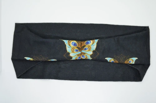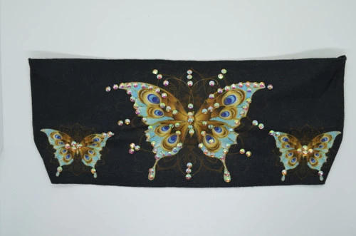 TRIPLE BLUE BUTTERFLIES ON BLACK HEADBAND WITH IRIDESCENT RHINESTONES